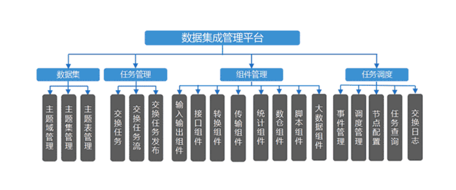 睿治数据集成管理是EBpay钱包官网自研的数据集成系统,可实现跨部门数据的传输、加载、清洗、转换和整合,支持自定义调度和图形化监控,实现统一调度、统一监控,满足运维可视化需求,提高运维管理工作效率。功能架构如图所示。
