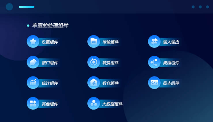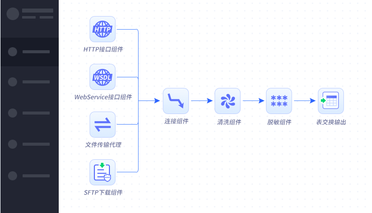 系统内置各种数据交换组件、数据处理组件,如表交换、文件传输、SFTP上传下载、Http组件、清洗与转换组件,满足各种不同场景的数据传输交换需求。