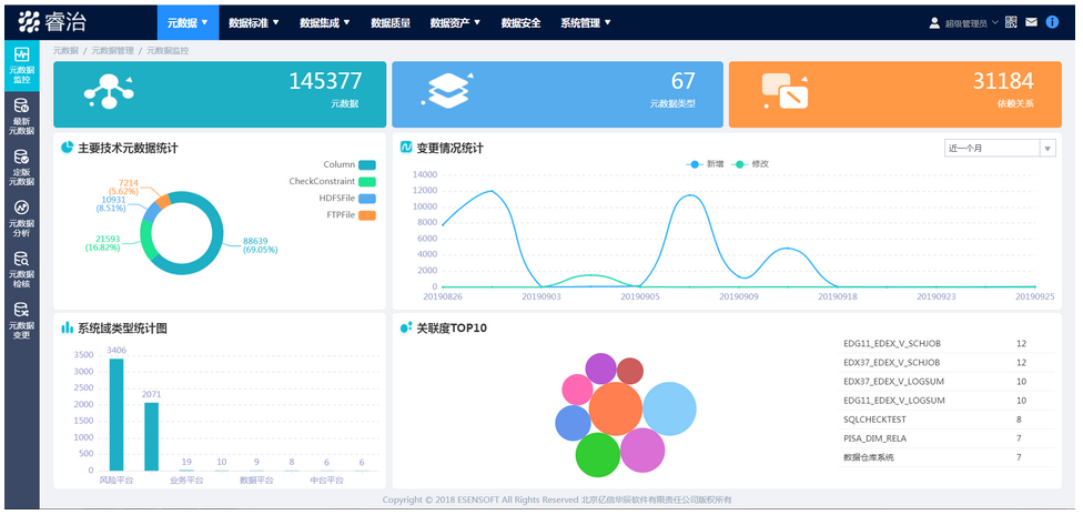EBpay钱包官网元数据管理平台给予了完善的元数据监控功能帮助用户一目了然的分析元数据的使用情况和分布情况,以统计图的方式来展现元数据数量,分布情况,近期变更情况,关联度情况等,可视化效果好并且支持按照用户需求来自定义监控界面。