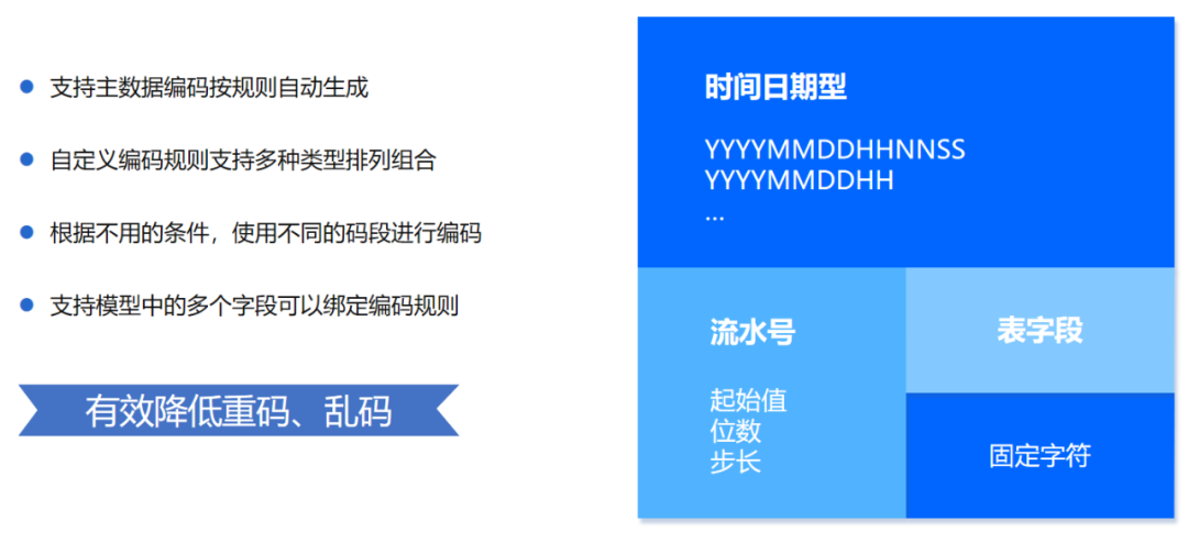 现在我们经历过的主数据项目中往往都会存在一物多码的问题,在平台中用户可以设置填报数据自动生成编码,用户可以根据标准规范,使用日期、字段、字符、流水号多种组合方式定义编码的规则,有效控制数据编码质量,避免数据的重码、乱码现象。
